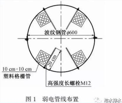 保護(hù)管采用φ600波紋鋼管結(jié)構(gòu),布置在地下雨水箱涵左側(cè)上方,纜線管廊兩端做封堵處理。
