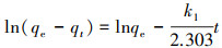 式中, qe和qt分別是吸附平衡時和t時刻的吸附容量(mg· g-1), t為吸附時間(min), k1為準(zhǔn)一級動力學(xué)吸附速率常數(shù)(min-1), k2為準(zhǔn)二級動力學(xué)吸附常數(shù)(g· mg-1· min-1).