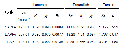 準(zhǔn)確稱取0.02 g SAPFe或DAPFe置于20 mL Cu2+初始濃度分別為10、20、50、100、150、200 mg·L-1的溶液中, 25 ℃、150 r·min-1下振蕩反應(yīng)24 h, 溶液通過0.45 μm濾膜后, 分析剩余Cu2+濃度, 計算吸附劑的吸附量.吸附等溫線采用Langmuir、Freundlich、Temkin模型方程進行擬合, 其表達式分別如下: