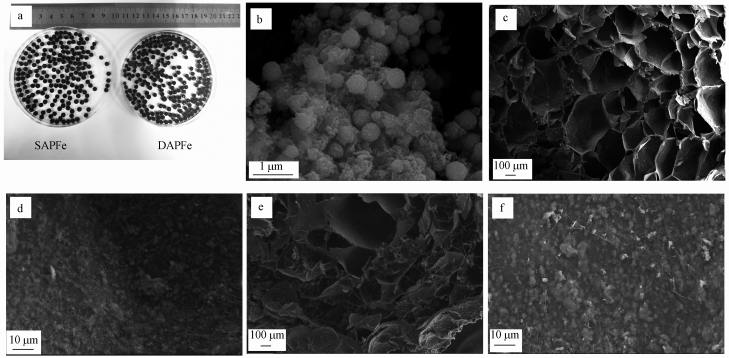 圖 1水凝膠及磁性納米Fe3O4的表觀形貌(a.磁性水凝膠球的光學(xué)照片, b.磁性納米Fe3O4, c、d.SAPFe, e、f.DAPFe)
