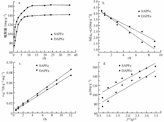 為了研究SAPFe和DAPFe對Cu2+的吸附速率, 對其進行吸附動力學(xué)試驗, 吸附動力學(xué)模型擬合結(jié)果如圖 5a所示.5 h內(nèi)SAPFe和DAPFe對Cu2+的吸附量分別迅速增加到130.8和144.2 mg·g-1; SAPFe在6 h以后基本達到吸附平衡, DAPFe在9 h后達到吸附平衡; 最終, SAPFe和DAPFe對200 mg·L-1 Cu2+的平衡吸附量分別為141.8和162.5 mg·g-1; SAPFe對Cu2+的吸附速率大于DAPFe.DAPFe比表面積較大, 孔結(jié)構(gòu)相對致密, 孔徑較小, 因此, 吸附速率較慢.