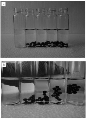 圖 4為外加磁場作用下負載0、2.5%、5%、12.5%、25%納米Fe3O4的SAPFe和DAPFe的磁性效果圖, 其中, 納米Fe3O4占海藻酸鈉和聚乙烯醇總量12.5%和25%的凝膠球均表現(xiàn)出了良好的磁性能.結(jié)合含水率結(jié)果確定納米磁性Fe3O4的適宜負載量為12.5%, 并作為后續(xù)吸附試驗中凝膠材料負載磁性納米Fe3O4的用量.