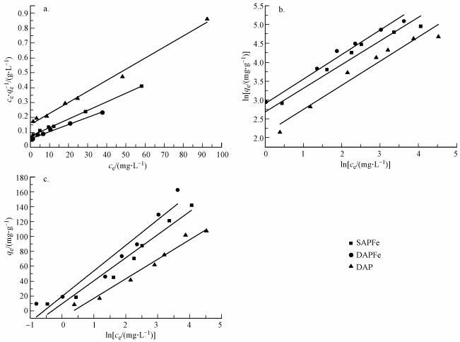 圖 6 SAPFe、DAPFe和DAP對Cu2+的吸附等溫線(a. Langmuir, b.Frendlich, c.Tempkin)