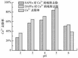 在pH為2~6范圍內(nèi)研究磁性高分子復(fù)合水凝膠的吸附性能, 結(jié)果如圖 7所示.隨著pH的增加, 吸附容量增大.在低pH值時, 溶液中的H+抑制了羧基和羥基的脫質(zhì)子作用, 螯合作用減弱, SAPFe和DAPFe對Cu2+的吸附容量低; 當(dāng)pH增大時, H+濃度降低, 羧基和羥基更容易發(fā)生脫質(zhì)子作用, 因而促進了吸附.另外, 空白對照實驗中發(fā)現(xiàn)pH在2~5之間無明顯的Cu2+沉淀現(xiàn)象發(fā)生, 而在pH=6時, 有微弱的沉淀現(xiàn)象.因此, 在pH為2~5之間主要為材料對Cu2+的吸附, 而在pH=6時, 沉淀作用對吸附也可能有一定的貢獻.