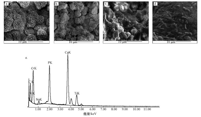 圖 2 CA (a)、CA+PC (b)、CA+B (c)和CA+B+PC (d)的電鏡掃描圖及CA+B+PC的能譜分析圖(e)