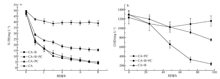 試驗(yàn)對(duì)比了CA+B、CA+PC、CA+B+PC材料去除染料及高COD的能力(圖 4).從圖 4a可以看出,在60 min內(nèi),3種材料對(duì)染料的去除效率都較高,這主要是由于材料的吸附作用.隨著時(shí)間的延長(zhǎng),脫色速率減小,反應(yīng)8 h后,CA載體、CA+B、CA+PC、CA+B+PC對(duì)染料的去除率分別為20%、68%、92%和94%.CA+B在前8 h染料去除率低可能是因?yàn)榧?xì)菌剛進(jìn)入一個(gè)新的環(huán)境,需要一定的適應(yīng)期;CA+PC和CA+B+PC的染料去除率也幾乎一致.相應(yīng)各材料的COD去除能力隨時(shí)間變化如圖 4b所示.CA+B+PC中剩余COD僅為200 mg · L-1左右,遠(yuǎn)小于CA+PC反應(yīng)中的剩余COD,而CA+B的剩余COD僅次于CA+B+PC.
