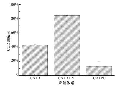 繼續(xù)進(jìn)行高COD的模擬印染廢水的降解試驗(yàn),收集反應(yīng)96 h后剩余COD的數(shù)據(jù)并計(jì)算相應(yīng)COD的去除率(圖 5).由圖 5可見,CA+B、CA+PC和CA+B+PC的COD去除率分別為13.0%、42.9%、84.7%.CA+PC與CA+B+PC對(duì)COD去除率的不同在于光合細(xì)菌的作用.光催化劑產(chǎn)生的自由基由于受到模擬廢水中加入的NaHCO3、NH4Cl等的影響及氧氣的限制,并不能完全礦化反應(yīng)體系中的有機(jī)物,累積中間產(chǎn)物使得COD去除率較低(Konstantinou et al., 2004;Guillard et al., 2003).相反地,在光催化結(jié)合微生物反應(yīng)體系中,染料隨光催化降解產(chǎn)生的中間產(chǎn)物和可生化降解的葡萄糖一起進(jìn)入復(fù)合材料內(nèi)部,迅速被光合細(xì)菌降解、礦化.