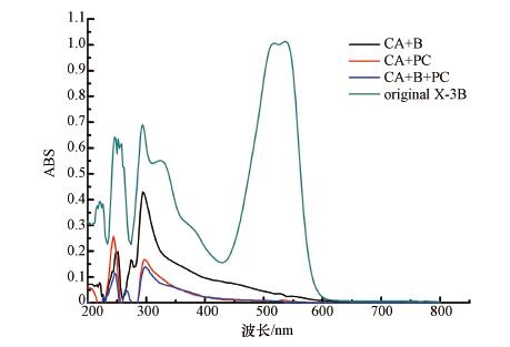 以模擬印染廢水為處理對(duì)象,廢水水質(zhì)如下:染料活性艷紅X-3B濃度為50 mg · L-1,COD(葡萄糖配)約1500 mg · L-1.選用300 W的鹵素?zé)糇鳛楣庠茨M太陽(yáng)光,對(duì)比CA+PC、CA+B及CA+B+PC降解染料和COD的規(guī)律.反應(yīng)結(jié)束,取樣進(jìn)行UV-Vis(UV765,中國(guó))、FT-IR(Nicolet iS10,美國(guó))及GC-MS(Agilent5975,美國(guó))分析.