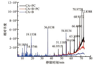通過GC-MS測(cè)定CA+B、CA+PC和CA+B+PC降解活性艷紅X-3B染料的產(chǎn)物.圖 8是氣相色譜的出峰圖,表 3是相應(yīng)停留時(shí)間對(duì)應(yīng)的物質(zhì).結(jié)合圖 8和表 3可發(fā)現(xiàn),反應(yīng)體系結(jié)束后,CA+B降解染料的中間產(chǎn)物主要是具有苯環(huán)結(jié)構(gòu)的芳香烴物質(zhì),以及少量的短鏈烷烴物質(zhì).而CA+PC體系中累積的中間產(chǎn)物主要為高分子量的長(zhǎng)鏈烷烴物質(zhì),芳香烴類的有機(jī)物相對(duì)較少.此外,在CA+B+PC反應(yīng)體系中,相比于CA+B,芳香烴類化合物含量減少,而對(duì)比于CA+PC,該反應(yīng)溶液中的長(zhǎng)鏈烷烴類物質(zhì)類型和含量都有所降低.基于以上試驗(yàn)結(jié)果,可以推測(cè)CA+B+PC中光催化與微生物的相互作用關(guān)系如下:最初,由于反應(yīng)溶液中含有大量的DO,在模擬太陽光的照射下(鹵素?zé)簦ㄩL(zhǎng)),光催化活性強(qiáng),活性艷紅X-3B染料的發(fā)色基團(tuán)在光催化與微生物的共同作用下被破壞,使其溶液脫色,此時(shí)光催化的脫色速率遠(yuǎn)遠(yuǎn)大于微生物脫色速率.然后,光催化劑產(chǎn)生的自由基繼續(xù)攻擊染料分子中的苯環(huán)結(jié)構(gòu),開環(huán)及一系列的加成聚合等反應(yīng)生成長(zhǎng)鏈烷烴化合物.隨著時(shí)間延長(zhǎng),DO量減少,光催化活性也隨之降低,長(zhǎng)鏈烷烴類物質(zhì)就很難繼續(xù)被降解.此時(shí)由于光合細(xì)菌的存在,長(zhǎng)鏈烷烴化合物易被微生物降解.總的來說,光催化劑的存在可以降低芳香烴物質(zhì)的累積量從而減少該化合物對(duì)微生物的影響,而體系中光合細(xì)菌又可以彌補(bǔ)光催化的缺點(diǎn).這就是復(fù)合材料降解模擬印染廢水中芳香烴與烷烴化合物濃度相對(duì)較低,COD和染料去除率高的原因.