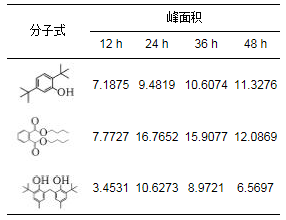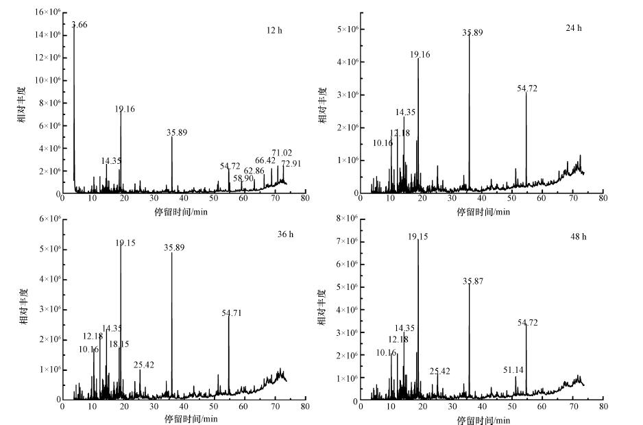為了更進(jìn)一步了解CA+B+PC降解染料的途徑,試驗(yàn)每隔12 h取樣,測(cè)定其COD(表 4),并利用GC-MS對(duì)中間產(chǎn)物進(jìn)行檢測(cè)分析(圖 9).反應(yīng)12 h的氣相出峰圖中,停留時(shí)間為58.90、62.86、66.42、71.02、72.91 min時(shí)的物質(zhì)都為長(zhǎng)鏈烷烴類化合物,而隨著反應(yīng)時(shí)間的延長(zhǎng),長(zhǎng)鏈烷烴物質(zhì)逐漸減少,36和48 h時(shí)幾乎不存在這些物質(zhì).圖 9中停留時(shí)間約為19.15、35.89和54.72 min左右的物質(zhì)分別為2, 4-二叔丁基苯酚、鄰苯二甲酸二丁酯、2, 2′-亞甲基雙-(4-甲基-6-叔丁基苯酚),這些具有芳香烴結(jié)構(gòu)的化合物峰面積變化規(guī)律如表 5所示.根據(jù)試驗(yàn)結(jié)果可以推測(cè),反應(yīng)前12 h,光催化降解染料速率遠(yuǎn)遠(yuǎn)大于光合細(xì)菌的降解速率,光催化起主導(dǎo)作用,此時(shí)溶液在脫色的同時(shí),一些自由基會(huì)破壞染料分子中的苯環(huán)結(jié)構(gòu),使其生成長(zhǎng)鏈烷烴類化合物.12 h后,由于光合細(xì)菌已經(jīng)開始適應(yīng)體系中的新環(huán)境,光合細(xì)菌降解染料生成苯環(huán)結(jié)構(gòu)化合物的同時(shí),可以即時(shí)迅速地將光催化氧化生成的長(zhǎng)鏈烷烴降解礦化.這也是CA+B+PC降解染料中后期一直沒有長(zhǎng)鏈烷烴化合物出現(xiàn)的原因.在12~24 h期間,可以發(fā)現(xiàn)芳香烴化合物迅速增加,24 h后減少,可能是因?yàn)榇藭r(shí)光合細(xì)菌作用大于光催化作用,酚類、酯類化合物生成量大于其降解量,使其累積,而后緩緩降解.