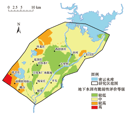 將各指標(biāo)圖層在ArcGIS軟件中完成矢量化、數(shù)值化, 并依據(jù)權(quán)重進(jìn)行疊加計(jì)算.將各評(píng)價(jià)指標(biāo)的分類(lèi)等級(jí)圖根據(jù)疊加公式進(jìn)行疊加分析, 結(jié)果重新劃分為4個(gè)等級(jí), 得到研究區(qū)地下水脆弱性等級(jí)分區(qū), 結(jié)果如圖 3所示.整個(gè)研究區(qū)有25.72%的地下水脆弱性等級(jí)為較低, 大部分位于研究區(qū)中部, 其中, 沙河、十里堡、西田各莊、王化水處理廠、梭草位于該區(qū)域, 地下水的防污性能最好.這是由于該區(qū)域地下水埋深較大, 土壤介質(zhì)、包氣帶介質(zhì)、含水層介質(zhì)類(lèi)型抗污性良好.整個(gè)研究區(qū)有61.79%的地下水脆弱性等級(jí)為中等, 其中, 范各莊、東白巖、平頭位于該區(qū)域.整個(gè)研究區(qū)有10.94%的地下水脆弱性等級(jí)為較高, 位于研究區(qū)西南部、西北部小部分區(qū)域, 其中, 懷北莊、前辛莊、前橋梓村東、桃山位于該區(qū)域.相對(duì)而言, 整個(gè)研究區(qū)僅有1.56%的地下水脆弱性等級(jí)為高, 位于研究區(qū)西南部小部分區(qū)域的地下水脆弱性等級(jí)為最高, 防污性能最差.這是由于該區(qū)域地下水埋深較小, 埋深最小位置在1.5 m以下, 土壤介質(zhì)為粉礫質(zhì)亞粘土、包氣帶介質(zhì)為風(fēng)化巖或塊狀灰?guī)r, 含水層介質(zhì)類(lèi)型較其他區(qū)域容易污染.
