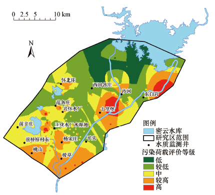 根據(jù)調(diào)查結(jié)果, 研究區(qū)地下水負(fù)荷風(fēng)險(xiǎn)的主要來(lái)源是家禽養(yǎng)殖場(chǎng)、加油站、垃圾填埋場(chǎng)、工業(yè)污染源和污水處理廠.將各種類(lèi)污染源圖層在ArcGIS軟件中完成矢量化、數(shù)值化后進(jìn)行疊加計(jì)算, 結(jié)果重新劃分為5個(gè)等級(jí), 得到研究區(qū)污染荷載評(píng)價(jià)等級(jí), 結(jié)果如圖 4所示.由圖 4可知, 污染載荷強(qiáng)的地區(qū)主要分布在研究區(qū)東部、東北部及西部零星地區(qū), 主要原因是受排污口的影響較大;污染載荷較強(qiáng)的地區(qū)主要分布在污染載荷強(qiáng)的地區(qū)周?chē)?污染載荷較弱、弱的地區(qū)主要分布在研究區(qū)的北部, 主要原因是該地區(qū)無(wú)工業(yè)污染源及排污口, 污染源較少.