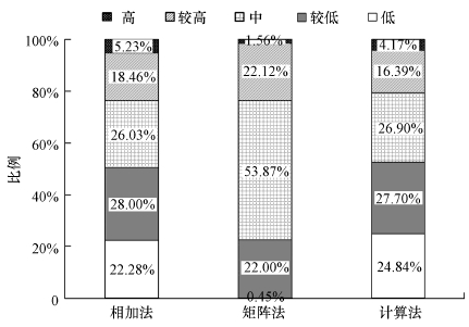 圖 6相加法、矩陣法和計(jì)算法地下水污染風(fēng)險(xiǎn)分區(qū)比例