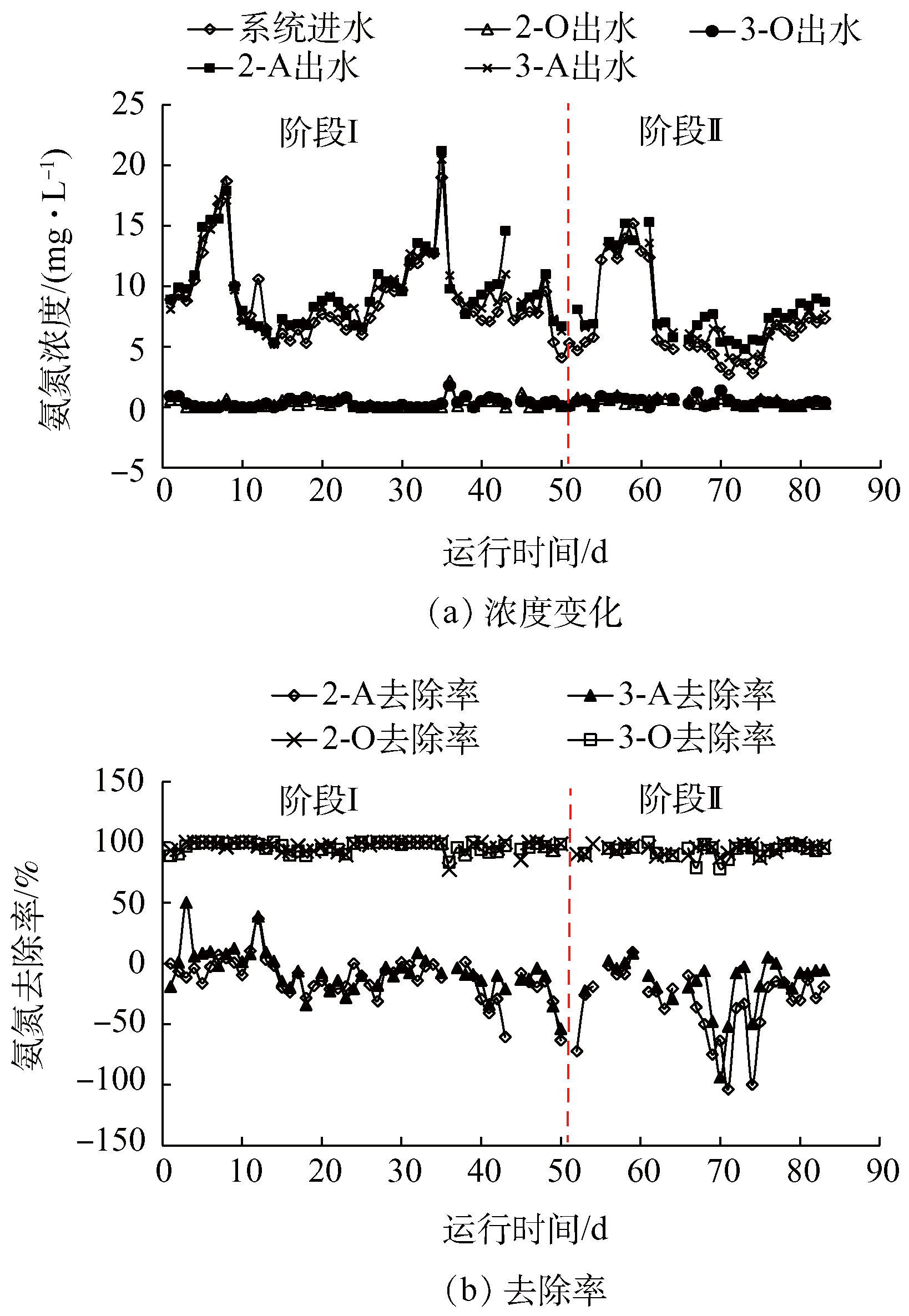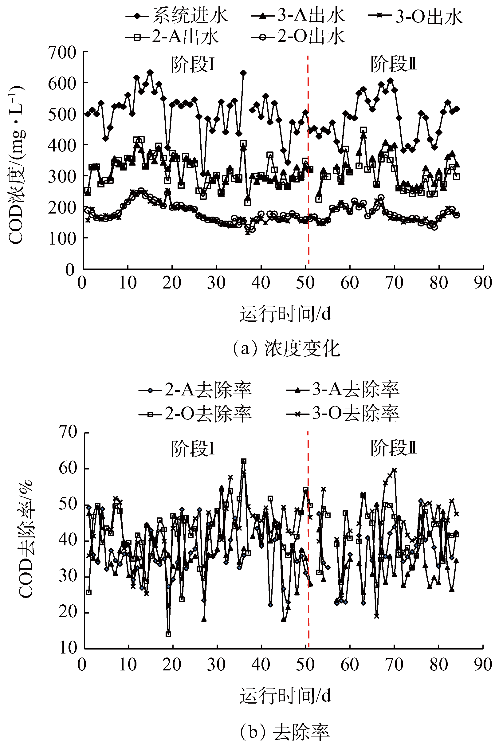 階段Ⅰ(第1~50天):將2套系統(tǒng)進(jìn)水調(diào)整為100%實(shí)際印染廢水后,為穩(wěn)定進(jìn)水條件,第11 天開始用濃硫酸將2套系統(tǒng)進(jìn)水pH均調(diào)節(jié)至6.0~6.5之間,運(yùn)行50 d之后2套系統(tǒng)出水水質(zhì)基本穩(wěn)定。