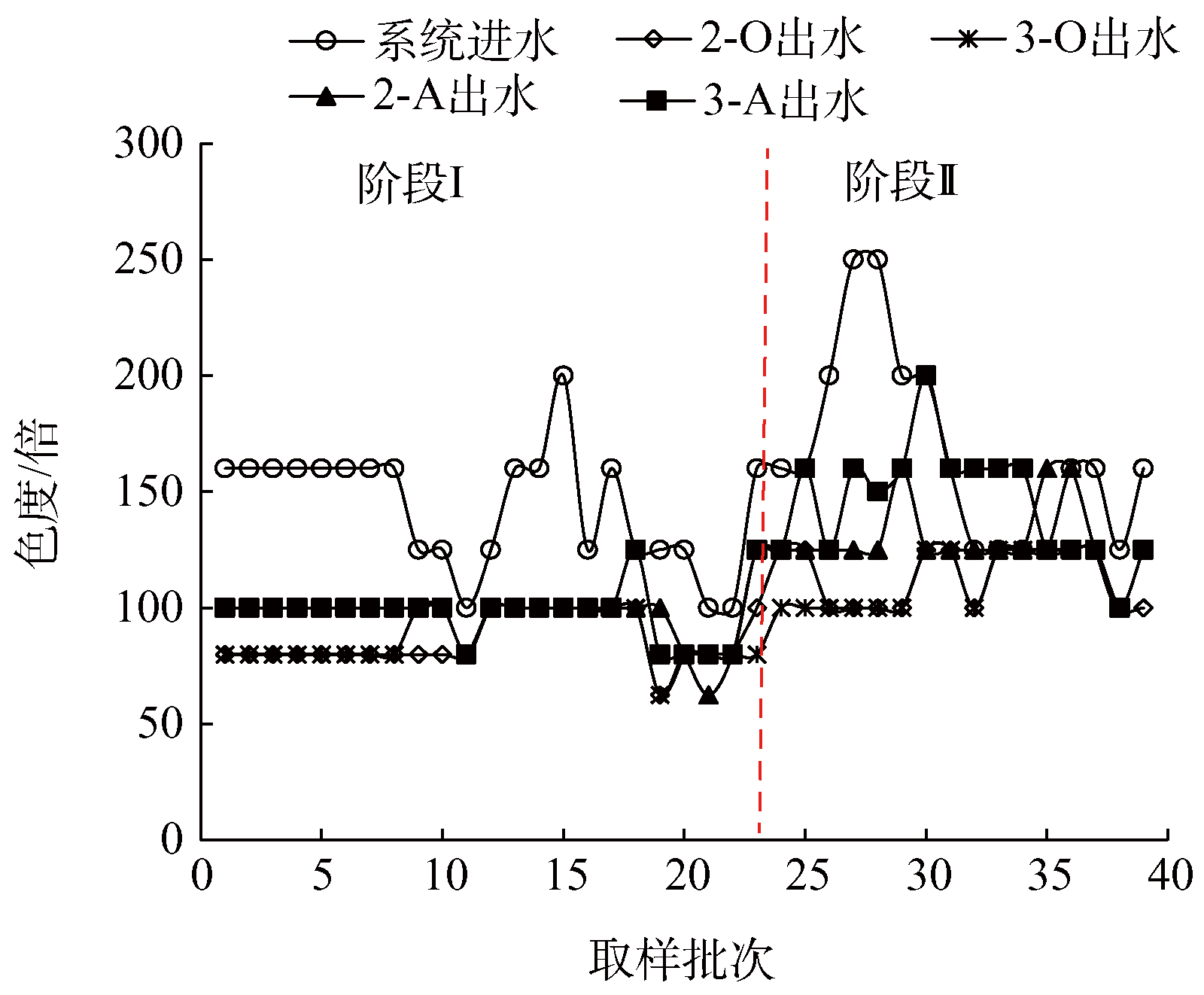 從階段Ⅰ第11天開始,用稀釋倍數(shù)法定期測定(平均間隔2 d測定1次)各體系進(jìn)出水色度,結(jié)果如圖5所示。階段Ⅱ向3-A投加雙氧水之后,3-A體系出水色度相比2-A體系波動(dòng)較大,基本在125~150 倍之間,既有高出2-A色度的情況,也有低于2-A色度的情形,但3-O和2-O體系出水色度仍然保持基本相同,在100~125 倍之間。