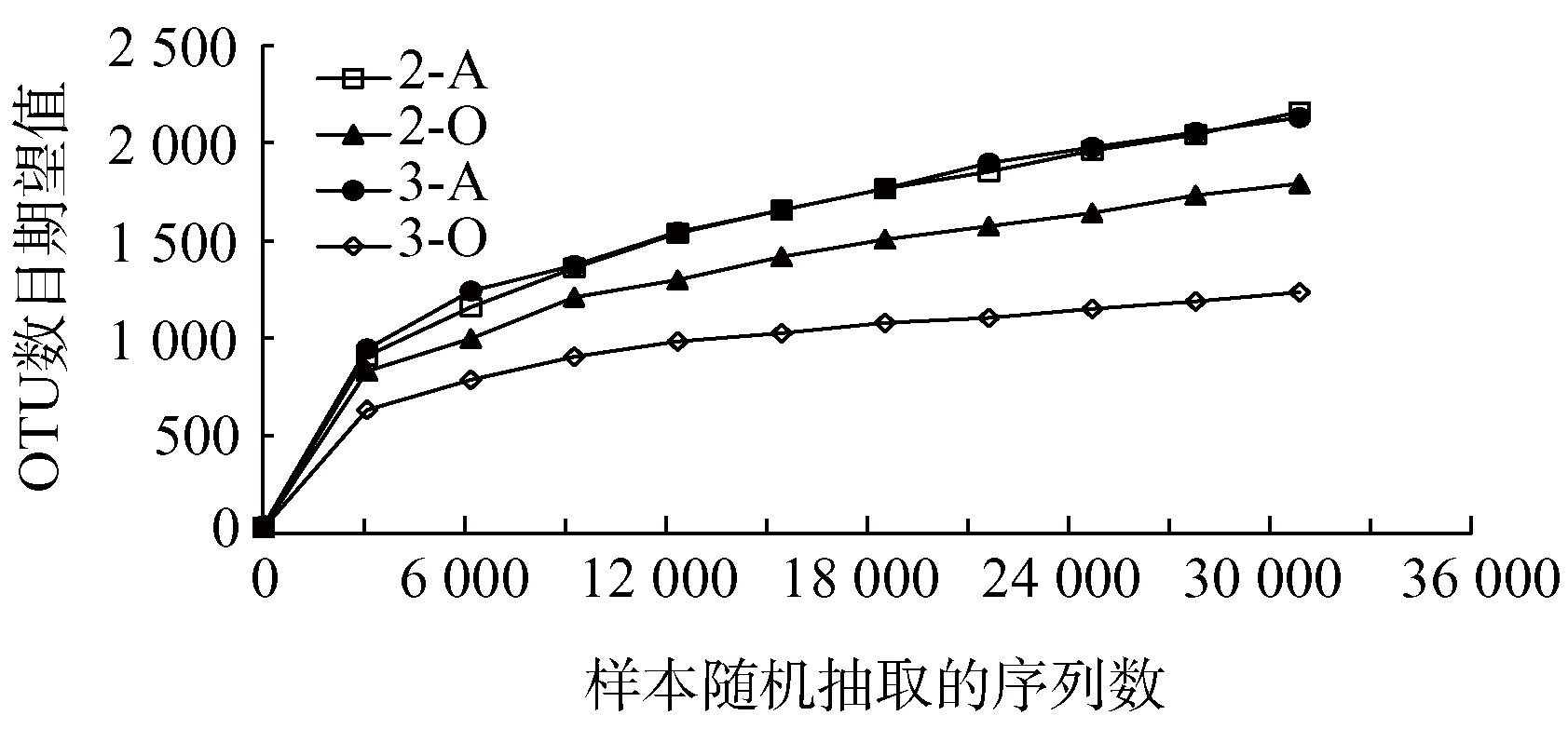 為了更深入地分析雙氧水投加對完全生化處理系統(tǒng)的影響,本實(shí)驗(yàn)在階段Ⅱ運(yùn)行期間(第70天),分別取雙氧水協(xié)同生化體系(3-A,3-O)以及完全生化處理對照體系(2-A,2-O)的污泥樣品,采用宏基因組16S rDNA測序法, 對這些樣品進(jìn)行微生物聚類與多樣性分析,并對各樣品中的微生物具體種類進(jìn)行了鑒定和解析。