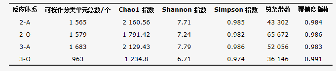 表2 各反應(yīng)體系中微生物種群多樣性指數(shù)