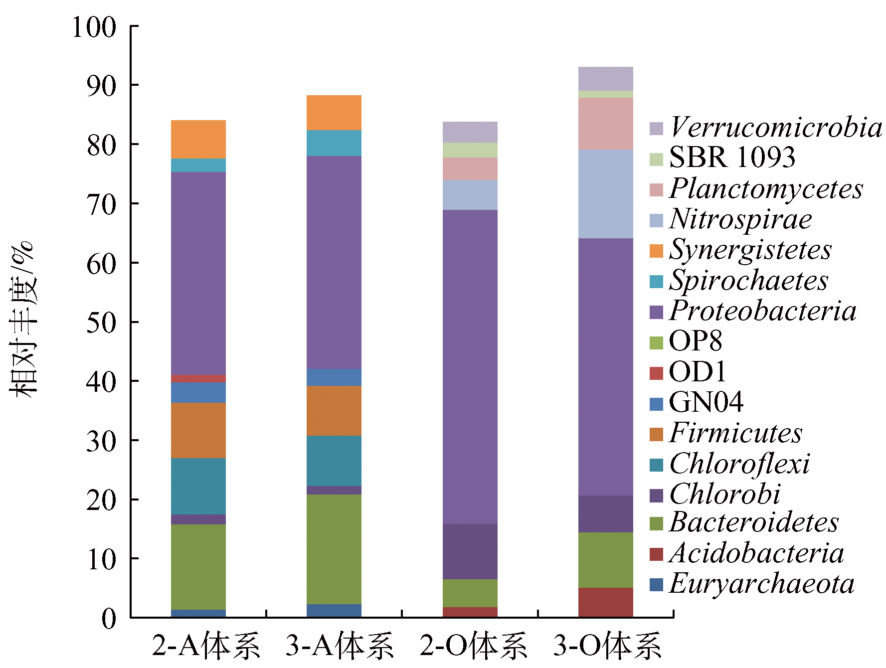 而表2中的可操作分類單元數(shù)目(OTU )為微生物聚類分析指標(biāo),每一個(gè)OTU通常被視為一個(gè)微生物物種,體系中OTU 數(shù)值越大,表明微生物物種越豐富;而Chao1指數(shù)、Shannon指數(shù)和Simpson指數(shù)均為微生物α多樣性的常用度量指標(biāo),Chao1值越大,代表樣品中物種總數(shù)越多;Shannon值和Simpson值越大,表明樣品的物種多樣性越高。比較本實(shí)驗(yàn)中各樣品的OTU數(shù)目及α多樣性指數(shù),可以看出投加雙氧水的3-A體系和未投加雙氧水的2-A體系中微生物的物種總數(shù)基本相同,但后續(xù)2套接觸氧化體系中微生物種類多樣性差異顯著,其中3-O體系物種多樣性遠(yuǎn)小于2-O體系,說明3-O體系內(nèi)的微生物種類趨于集中。