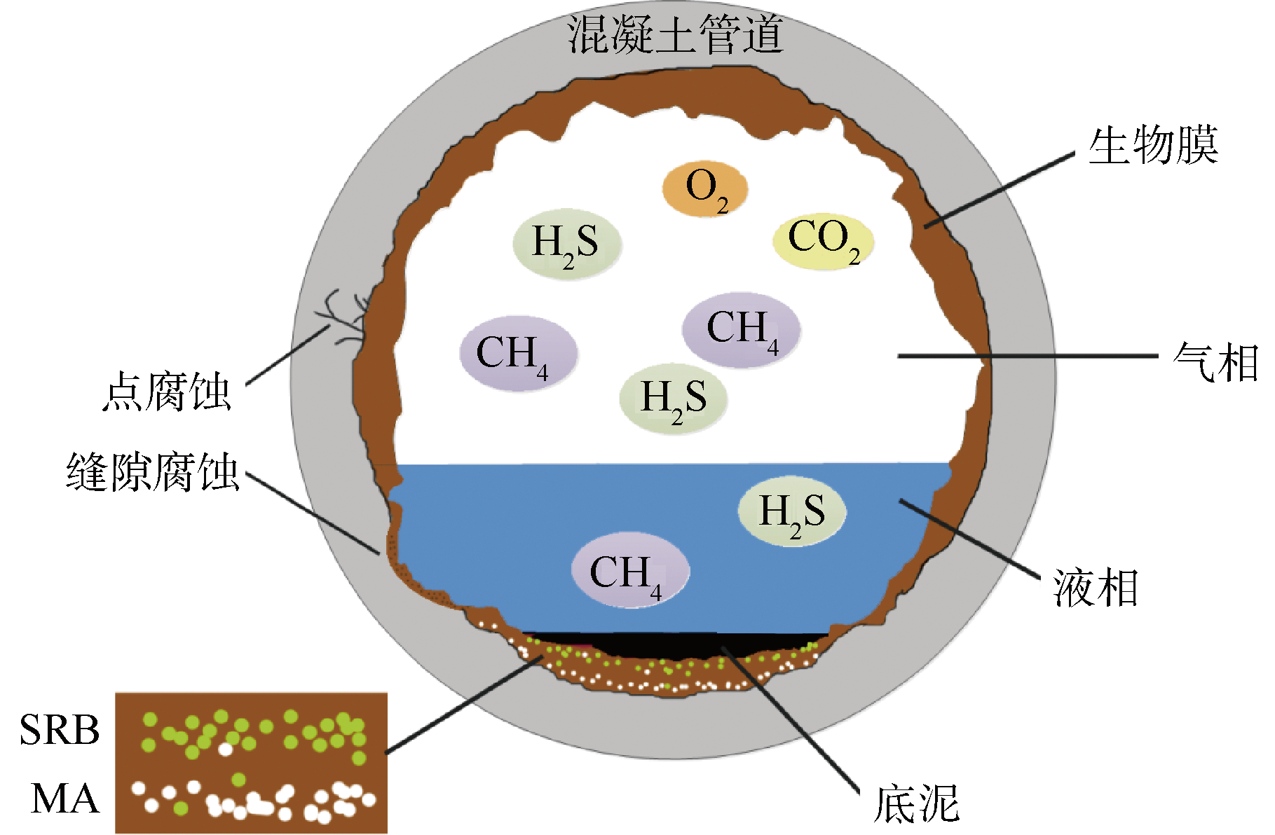 城市排水管道中的污水以生活污水為主,含有豐富的碳、氮、磷等營養(yǎng)物質(zhì),且管道內(nèi)部為密閉空間,為厭氧菌的生長提供了有利條件。實際管道生物膜中的細菌以擬桿菌綱、β-變形菌綱、δ-變形菌綱為主,古菌則以甲烷鬃毛狀菌科、甲烷球菌科為主。SRB還原硫酸鹽所產(chǎn)生的H2S是管道腐蝕的主要原因,同時,研究表明,污水在管道輸送途中削減了大量sCOD,其中72%的削減量來自于產(chǎn)甲烷過程。因此,SRB和MA是管道中的2種關鍵菌群,實際管道中液相CH4、H2S濃度可達30 mg·L−1、12 mg·L−1 。目前,國內(nèi)排水管道的材質(zhì)多為混凝土,管道內(nèi)壁粗糙不平、比表面積較大,雖然水泥的水化過程產(chǎn)生了較高的堿度,但H2S的積累逐漸降低了液相pH,同時腐蝕管道表面,使微生物能夠不斷侵入管壁內(nèi)部,進一步加劇管道結構破損(見圖1)。