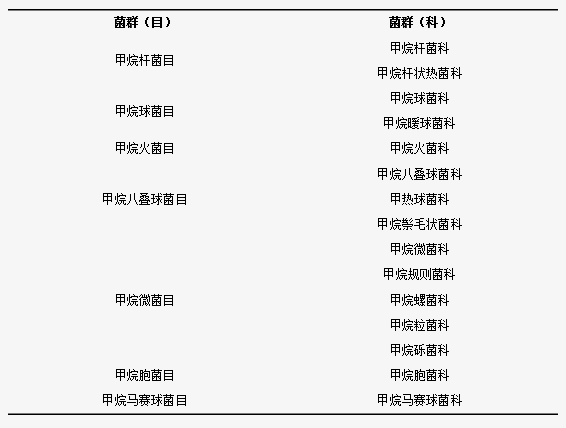 MA是專性厭氧古菌,能夠以乙酸、H2/CO2、甲基類化合物為底物合成甲烷,其代謝途徑也相應地分為乙酸途徑、CO2還原途徑和甲基裂解途徑。MA屬于廣古細菌門,現(xiàn)已鑒定出的菌株可分為7目、15科、35屬、150多個有效種(見表2)。