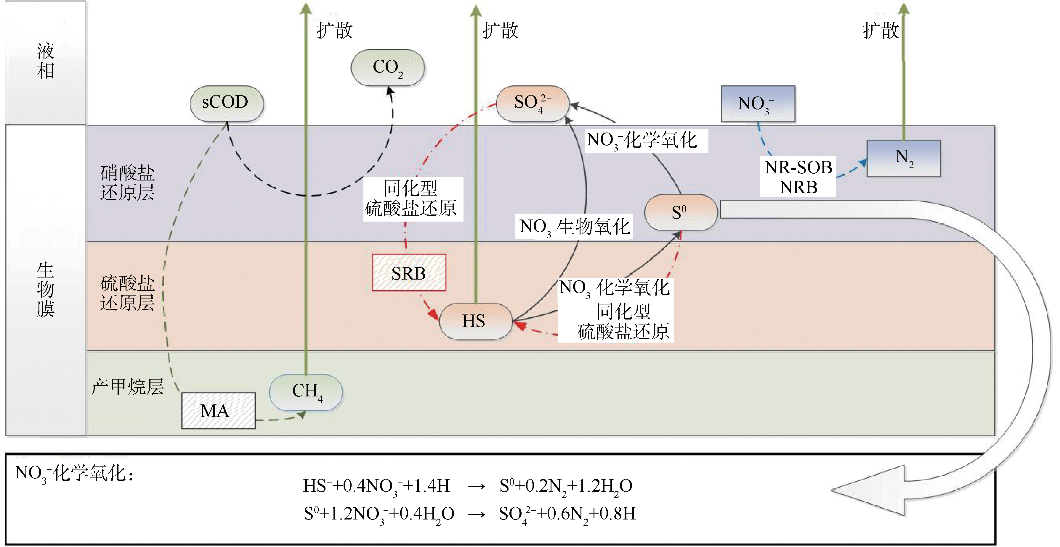 硝酸鹽對MA亦有副作用,原因可歸結為氧化還原電位的改變及硝酸鹽對甲烷的化學氧化。然而,由于SRB、MA在生物膜中處于分層分布,因此生物膜由上到下可分為硝酸鹽還原層、硫酸鹽還原層和產(chǎn)甲烷層[55-56](見圖5)。深層的MA可以利用sCOD而繼續(xù)生長,只有長期投加硝酸鹽才能抑制MA。