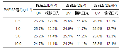 1) 紫外燈照射下DMP、DEP和DEHP的降解速率明顯大于模擬日光燈照射下的降解速率.在研究濃度范圍內(nèi)(0.5 ~10 μg·L-1), 隨著PAEs初始濃度的增加, 降解率呈現(xiàn)減小趨勢(shì).
