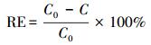 金屬離子去除率(RE)是指吸附前后目標(biāo)金屬離子濃度差與初始濃度的比值, 其計(jì)算公式如下所示: