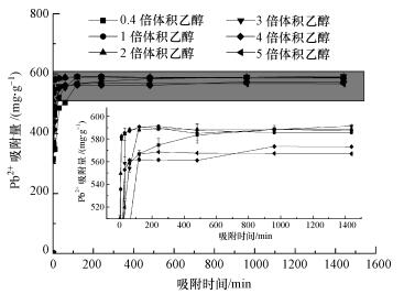 在同一種提取方法下, 不同的乙醇體積沉淀所獲得的粗多糖不同.圖 4顯示了濃堿-凍融法在不同倍體積無(wú)水乙醇沉淀下獲得的粗多糖對(duì)Pb2+的吸附結(jié)果.由圖可知, 反應(yīng)迅速達(dá)到吸附平衡, 在初始Pb2+濃度為0.6 mg·mL-1時(shí), 3倍乙醇沉淀后對(duì)Pb2+的吸附量達(dá)到最大, 為591.36 mg·g-1, 去除率為98.56%, 接近100%.因此, 利用濃堿法-凍融法3倍乙醇沉淀后得到的粗多糖樣品進(jìn)行后續(xù)的吸附試驗(yàn).