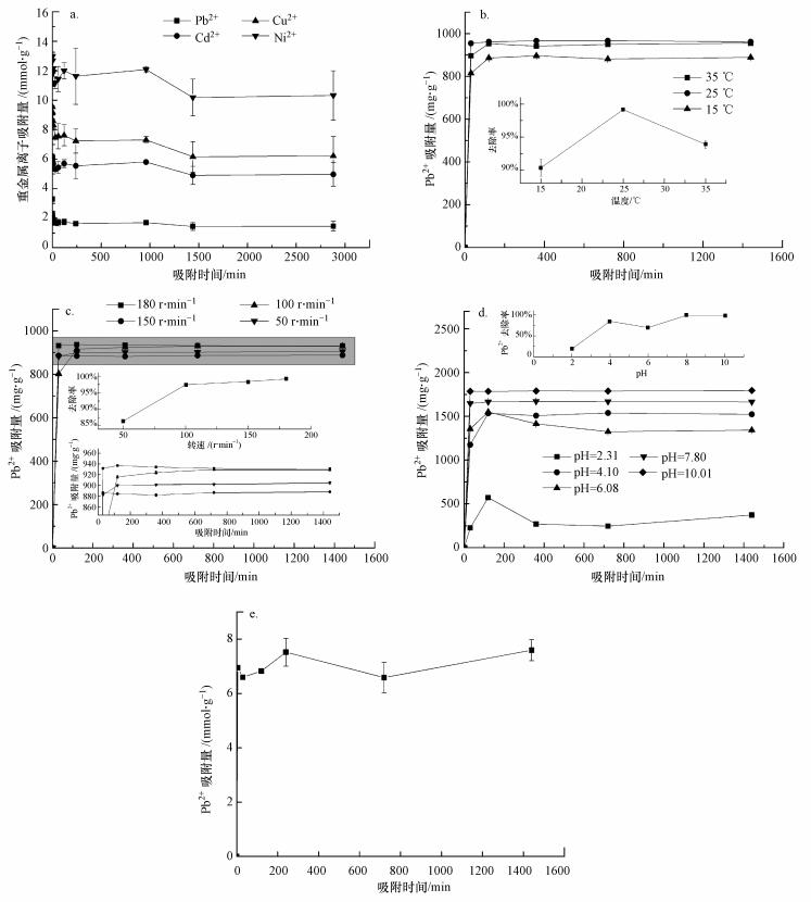 圖 5不同因子對(duì)粗多糖的Pb2+吸附性能影響 (a.共存Cd2+、Pb2+、Cu2+和Ni2+, b.溫度, c.轉(zhuǎn)速, d.pH, e.吸附時(shí)間)