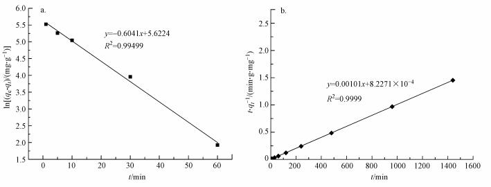 圖 6粗多糖吸附Pb2+的偽一級(jí)(a)、二級(jí)(b)動(dòng)力學(xué)模型擬合