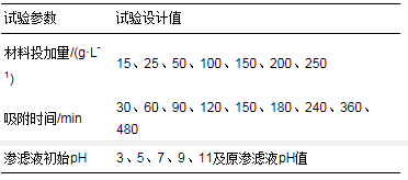 于250 mL錐形瓶中加入10 g吸附材料和200 mL原始滲濾液, 置于恒溫振蕩器(25 ℃, 140 r · min-1)中振蕩120 min后靜置沉淀, 檢測(cè)吸附后的上清液與過(guò)濾后的原滲濾液中污染物濃度.各單因素影響試驗(yàn)在保證其他因素不變情況下, 按照表 3中各因素設(shè)計(jì)值進(jìn)行.