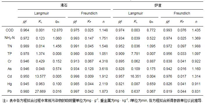 動(dòng)力學(xué)二級(jí)方程對(duì)于沸石和爐渣吸附各種污染物的擬合效果均較好(表 7), 擬合所得平衡吸附量qe(cal)與實(shí)測(cè)值qe(exp)相近.這說(shuō)明對(duì)污染物的吸附作用既有表面、孔內(nèi)擴(kuò)散的物理作用, 也包含離子交換等化學(xué)作用, 但整個(gè)吸附過(guò)程以化學(xué)反應(yīng)為主.