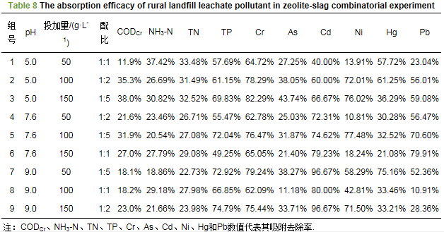 表 8對(duì)比了正交實(shí)驗(yàn)條件下沸石-爐渣組合材料對(duì)垃圾滲濾液污染物的吸附去除效果.由于爐渣自身特性的影響, 沸石對(duì)于NH3-N和TN的去除效率沒(méi)有得到很好的發(fā)揮, 組合材料去除氮元素的效果沒(méi)有得到最大程度的提升.而組合材料對(duì)磷元素的去除效率有了較大的改善, 對(duì)重金屬的去除效果也保持了爐渣的高性能.材料配比為1 : 5、pH值為5、吸附劑投加量為150 g · L-1時(shí), 污染物去除效果較好, 但各因素水平間的變化對(duì)試驗(yàn)結(jié)果并不顯著, 故在實(shí)際中, 考慮運(yùn)行成本及操作性可選取pH為自然值及投加量為50 g · L-1的條件下進(jìn)行反應(yīng).