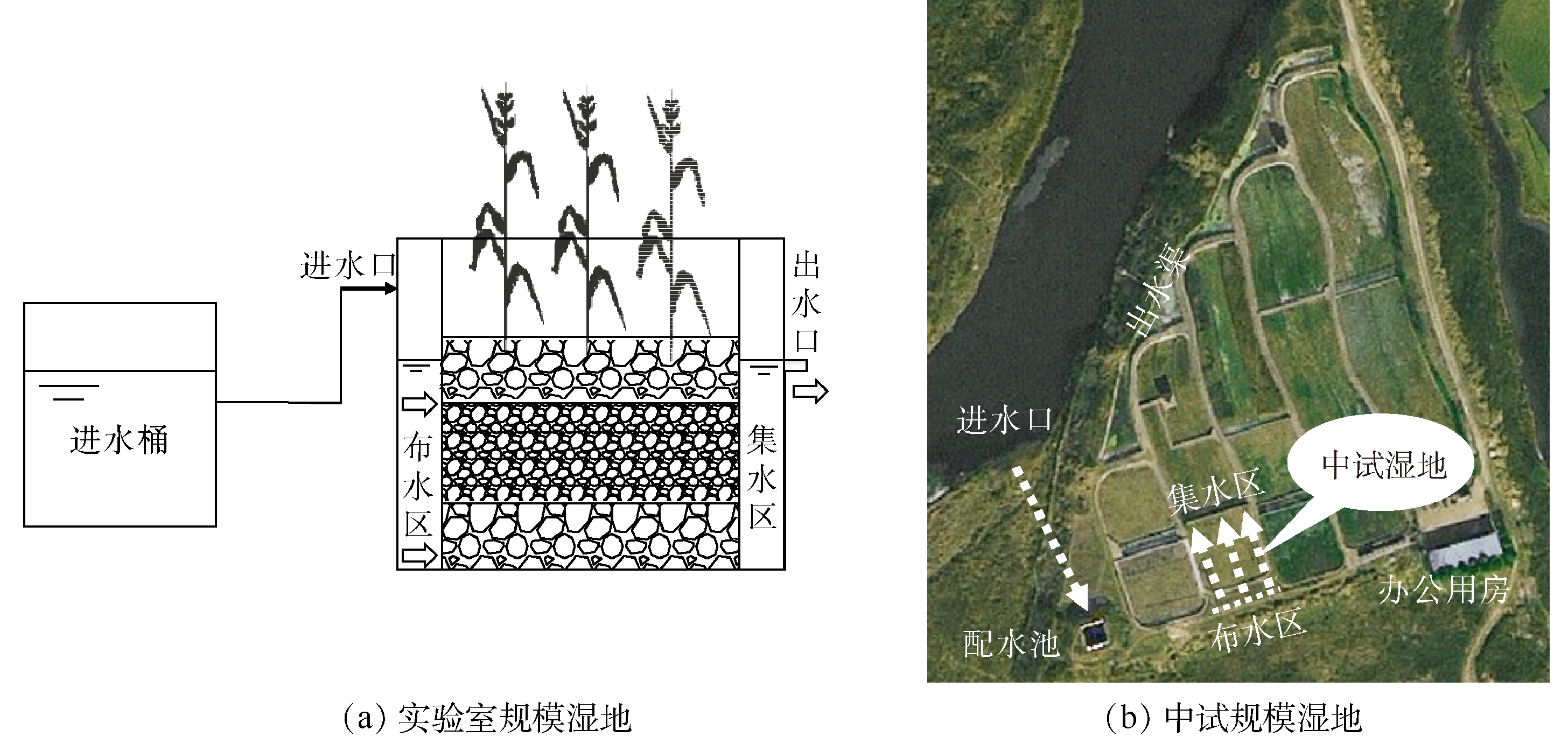 實驗室規(guī)模人工濕地位于西安建筑科技大學校內(nèi),采用15 mm厚的有機玻璃構建,濕地長×寬×高為0.55 m×0.55 m×0.80 m(圖1(a)),濕地填料為5~30 mm 的爐渣,鋪設高度60 cm,濕地種植植物為蘆葦(13株·m−2)。中試規(guī)模人工濕地位于西安市皂河入渭河口(圖1(b)),濕地長×寬×高為17 m×20 m×0.80 m,濕地填料為1~70 mm的爐渣,鋪設高度60 cm,濕地種植植物為蘆葦(9株·m−2)。2組人工濕地中所種蘆葦取自皂河河灘,爐渣基質取自皂河附近電廠。2組人工濕地進水均為皂河河水,水力負荷均為0.1 m·d−1,其中中試濕地現(xiàn)場抽取河水進入濕地,實驗室規(guī)模濕地在中試濕地取水處取水待用。2組人工濕地均為水平潛流人工濕地,水位維持在基質表層以下10 cm,河水水平流經(jīng)人工濕地,在濕地前端和后端分別采用大粒徑碎石作為布水區(qū)和集水區(qū),優(yōu)化系統(tǒng)運行。