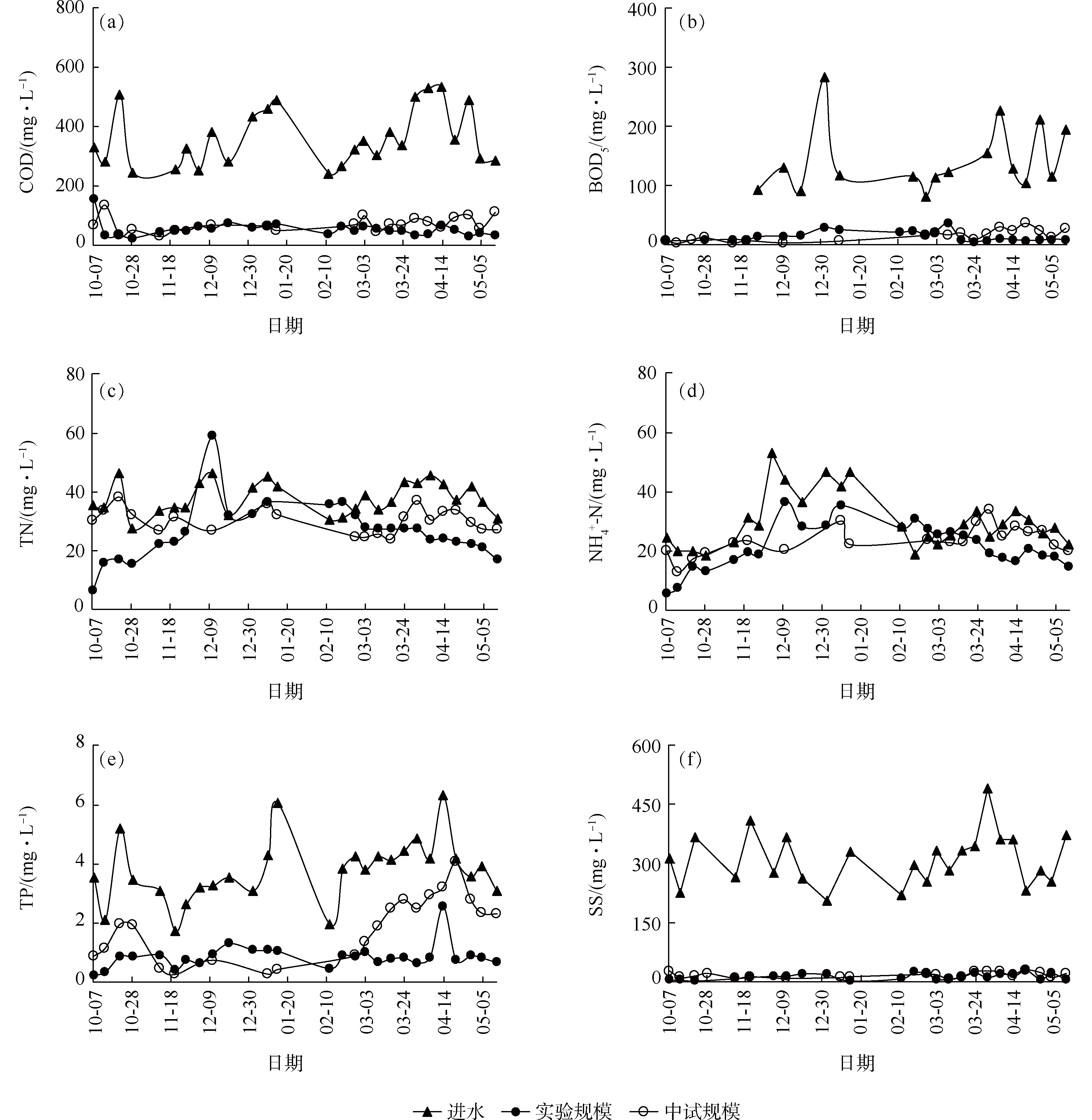 1)2組不同尺度人工濕地對SS、COD、BOD5去除效果相近(P<0.05),實驗室規(guī)模人工濕地的去除率分別為95.86%、85.29%和90.60%,中試規(guī)模人工濕地則分別為94.74%、80.41%與89.99%。2組人工濕地相同的填料種類和運行方式以及差異化的微生物特性是造成這一結果的主要原因。