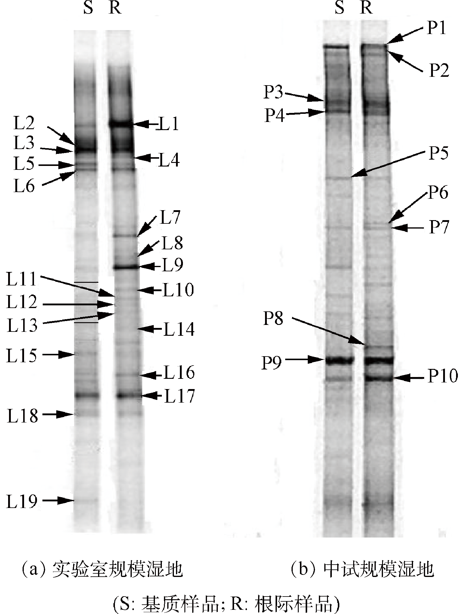 圖3為2組人工濕地內(nèi)基質和植物根際樣品的總細菌群落16S rDNA片段的DGGE圖譜?梢钥闯,實驗規(guī)模人工濕地的基質樣本條帶數(shù)和根際樣本條帶數(shù)均比中試規(guī)模濕地的多,說明實驗室規(guī)模人工濕地的微生物群落多樣性更高。另外,DGGE圖譜中的條帶亮度與微生物數(shù)量相關。從圖3可以看出,實驗室規(guī)模濕地中所檢測到亮度較高的代表條帶有L1、L2、L3、L6、L9、L15、L16和L17,而中試濕地中所檢測到的代表條帶有P1、P3、P4、P9和P10,這些條帶指示菌分別為2組濕地中的優(yōu)勢菌屬。