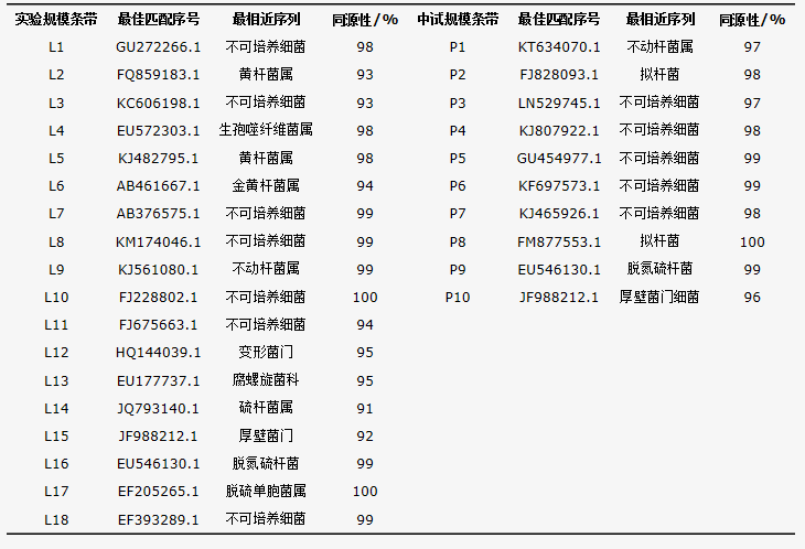 將變性梯度凝膠中與上述相應的條帶切下并進行克隆測序,得到其DNA序列(表3)。結果表明,2種尺度人工濕地都能檢測出不動桿菌屬細菌(Acinetobacter tjernbergiae)、脫氮硫桿菌(Thiobacillus denitrificans)和厚壁菌門細菌(Firmicutes),而實驗室規(guī)模濕地中則存在特有的優(yōu)勢菌屬:黃桿菌屬(Flavobacterium sp.)、金黃桿菌屬(Chryseobacterium sp.)。對于人工濕地的不同組成元素而言,不動桿菌屬細菌主要存在于植物根際,這是因為不動桿菌屬包含能發(fā)生高效聚磷的聚磷菌,而聚磷菌在富集磷時需要好氧條件,根際的泌氧作用為其生成提供條件,因此主要附著在根際區(qū)。2組濕地中共有菌屬中的脫氮桿菌包含能發(fā)生硝化作用的硝化菌,也包含能發(fā)生反硝化作用的反硝化菌;脫硫菌和厚壁菌門細菌中的硫酸鹽還原菌除可脫硫外,也可降解有機污染物。此外,實驗室規(guī)模人工濕地所特有的黃桿菌和金黃桿菌在低氧或無氧條件下具有反硝化脫氮作用,同時也可以降解蛋白質、脂類、纖維素以及芳香烴類等高分子有機物。綜上可知,實驗規(guī)模人工濕地內(nèi)具有優(yōu)于中試濕地的微生物群落數(shù)和能夠降解有機物和氮的微生物種群,所以實驗室規(guī)模人工濕地具有更好的有機物和氮去除能力。