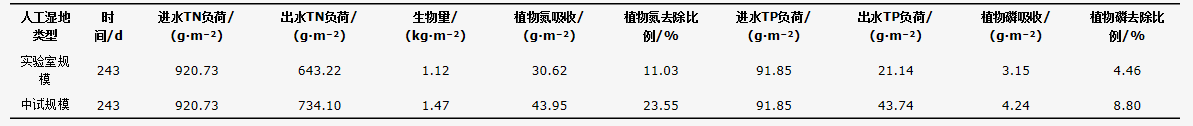 3)2組人工濕地對磷的去除也具有顯著差異(P<0.05),實驗室規(guī)模人工濕地對磷的去除效果(76.89%)優(yōu)于中試規(guī)模人工濕地(52.45%)。中試規(guī)模人工濕地中的植物具有更好的吸收去除磷的能力(4.24 g·m−2),但潛流人工濕地中污水與基質接觸較為充分,在所用基質爐渣具有較好的磷吸附能力的前提下,基質吸附比植物吸收能夠更好地促進人工濕地對污水中磷的去除。