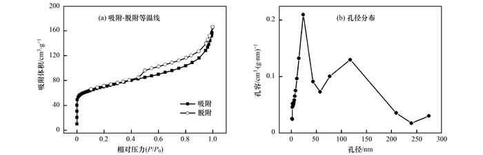 MBC的基本理化性質如表 2所示.從中可知, 制備的MBC上負載的Fe的質量分數達24.57%.利用滴定法測得其零點電荷為7.7. 圖 1(a)中N2吸附-脫附等溫線屬于IUPAC分類中的Ⅳ型, 在相對壓力為0.4~0.99區(qū)域內出現了H3型滯后環(huán), 表明MBC中存在較多的介孔, 這與Yu等和Lian等的研究結果一致.由圖 1(b)可知MBC的孔徑主要分布在0~50 nm和50~200 nm, 其平均孔徑為4.04 nm.介孔的存在有利于抗生素分子擴散到MBC的表面和內部[1].由N2吸附脫附結果得MBC的BET比表面積和總孔體積分別為254.6 m2·g-1和0.257 cm3·g-1. 圖 2顯示MBC的飽和磁化強度為6.71 A·m2·kg-1, 表現出較強的磁性, 有利于MBC從溶液中分離出來.