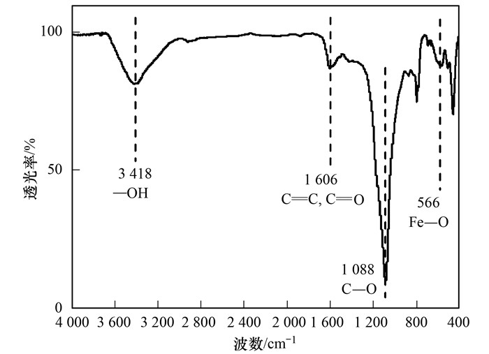 由MBC的紅外光譜圖可知(圖 4), 在3 418、1 606、1 088、566 cm-1處存在強的吸收峰. 566 cm-1處對應Fe—O的伸縮振動, 證明磁性炭上存在Fe3O4. 3 418 cm-1附近的寬峰為羥基(—OH)的伸縮振動, 1 606 cm-1處為C=C和C=O的伸縮振動, 1 088 cm-1為C—O的伸縮振動吸收峰.以上結果表明MBC含有豐富的含氧官能團和芳香基團.由Boehm滴定法測得MBC表面含氧官能團總量為1.598 mmol·g-1, 包括羧基、內酯基、酚羥基和羰基.這些含氧官能團可以與CIP和OFL分子結構中的F、O和N原子間形成氫鍵, 利于MBC吸附CIP和OFL.