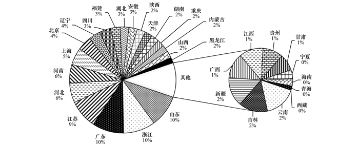 圖 1顯示了2014年中國各省市城鎮(zhèn)污水處理廠數(shù)量和溫室氣體排放情況, 圖 2顯示了中國各省市2014年城鎮(zhèn)污水處理廠溫室氣體對全國排放總量的貢獻(xiàn)率, 各省市當(dāng)年人均城鎮(zhèn)污水廠溫室氣體排放情況如圖 3所示.