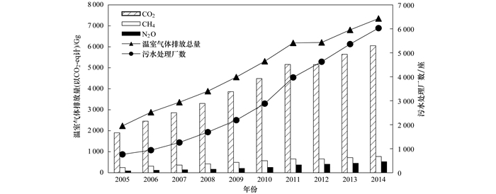 圖 4顯示了2005~2014年全國城鎮(zhèn)污水處理廠數(shù)量與溫室氣體年排放總量. 10年間, 隨著我國城鎮(zhèn)人口數(shù)量和對環(huán)保重視程度的增加, 全國城鎮(zhèn)污水處理廠數(shù)量飛速增長, 從2005年的764座增加到2014年的6031座.與之對應(yīng)的是通過污水廠排放的溫室氣體量, 從2005年的2230.97 Gg增加到了2014年的7348.60 Gg.