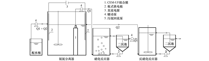 CEM-UF組合膜-硝化/反硝化系統(tǒng)如圖 1所示, 系統(tǒng)包括三部分, 分別為氨氮分離器、硝化反應(yīng)器和反硝化反應(yīng)器.氨氮分離器中, 板式CEM-UF組合膜[8]豎直放置于兩電極板間, 陽離子交換膜與陽極相對, 超濾膜與陰極相對, 兩電極板連接直流電源.
