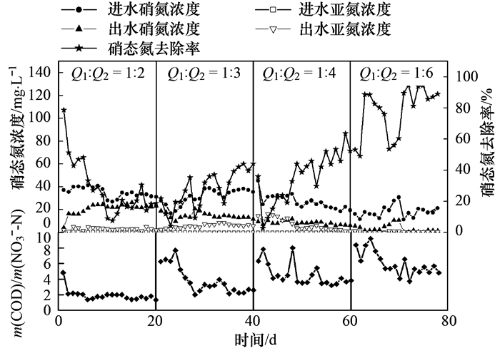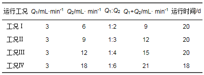 反硝化進(jìn)水流量比為硝化反應(yīng)器出水進(jìn)入反硝化反應(yīng)器的流量(Q1) :氨氮分離器出水進(jìn)入反硝化反應(yīng)器的流量(Q2), 系統(tǒng)的進(jìn)水流量為(Q1+Q2).根據(jù)反硝化進(jìn)水流量比的變化將運行分為4個工況, 實驗運行工況如表 2所示, 每個工況初始條件相同.