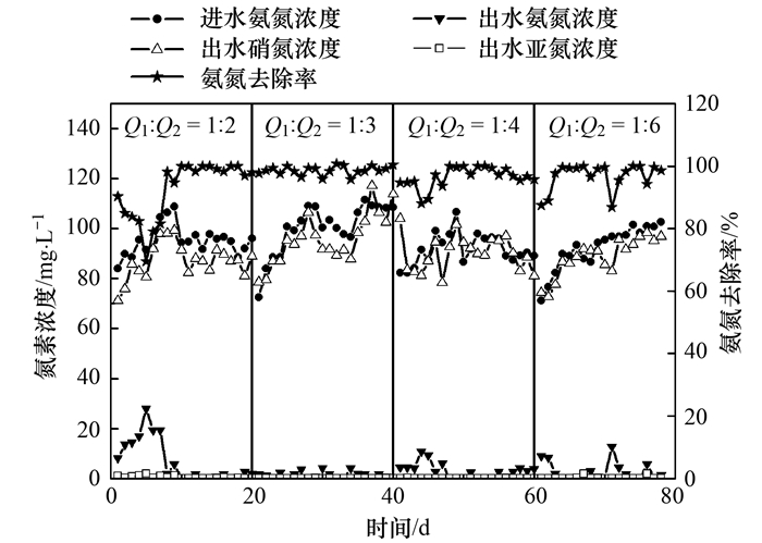 硝化進(jìn)水均來自于組合膜出水, 各工況下的硝化進(jìn)水流量不變且進(jìn)水濃度變化不大, 因此流量比的改變對于硝化反應(yīng)基本無影響.硝化反應(yīng)器中氨氮濃度、硝態(tài)氮濃度及氨氮去除率變化如圖 3所示.運行穩(wěn)定時硝化出水主要以硝酸鹽形式存在, 亞硝酸鹽濃度很低, 在0~0.48 mg ·L-1之間波動, 平均值為0.083 mg ·L-1.表明硝化作用進(jìn)行較完全.運行穩(wěn)定時平均出水氨氮濃度為1.22 mg ·L-1, 平均氨氮去除率為98.7%.