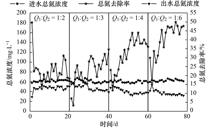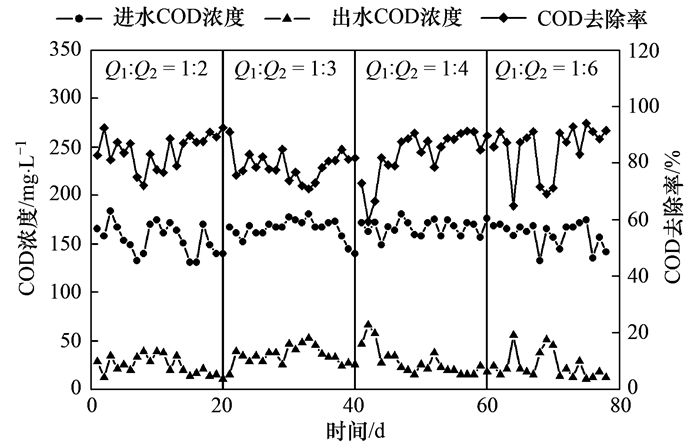 (2) 系統(tǒng)總氮去除率隨流量比增加逐漸增加, 流量比從1 :2、1 :3、1 :4增加到1 :6時, 總氮去除率從22.56%增加到46.8%;COD去除率在各流量比下均在80%以上, 最高可達(dá)93.97%.