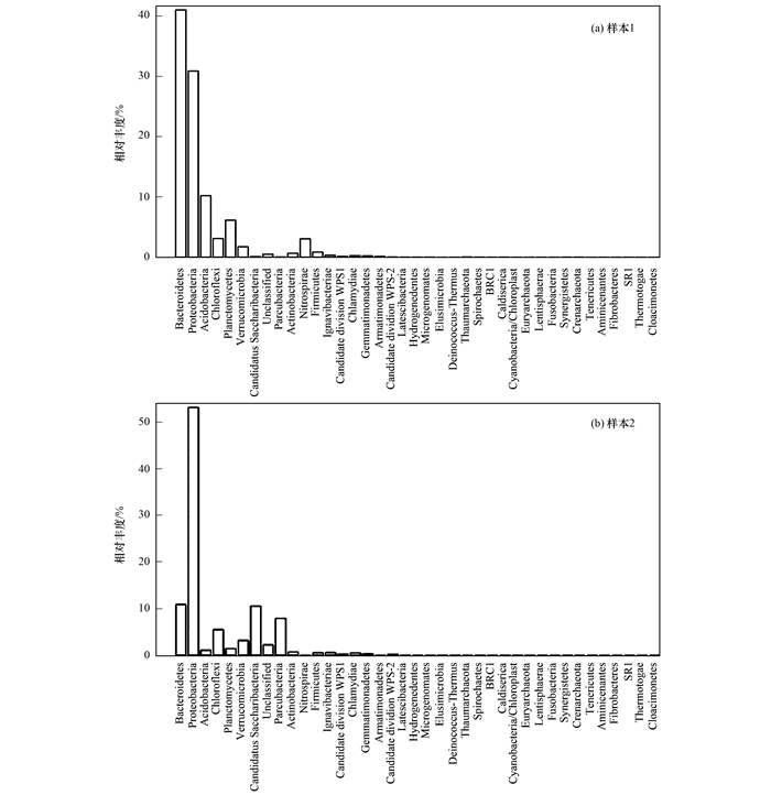 對兩個樣本進(jìn)行門水平下的菌種相對豐度分析如圖 7、表 4所示.與一些早期的關(guān)于活性污泥的研究相似, 樣本1(硝化反應(yīng)器中活性污泥)中主要菌群有Bacteroidetes(擬桿菌門41.04%)、Proteobacteria(變形菌門30.9%)、Acidobacteria(酸桿菌門10.24%)和Nitrospirae(硝化螺旋菌門3.06%).樣本2(反硝化反應(yīng)器中活性污泥)中主要菌群有Proteobacteria(變形菌門53.13%)、Bacteroidetes(擬桿菌門10.93%)、Candidatus Saccharibacteria(10.6%)和Chloroflexi(綠彎菌門5.56%).