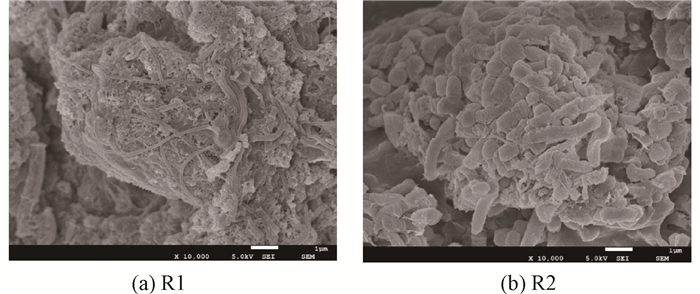 分別取運(yùn)行200 d的R1和R2反應(yīng)器內(nèi)污泥進(jìn)行電鏡掃描,分析表明,高溫段反應(yīng)器內(nèi)的微生物群落主要是桿狀和絲狀菌,而中溫段反應(yīng)器內(nèi)則是短桿和球形菌居多。2個(gè)反應(yīng)器內(nèi)微生物群落組成的差異主要來自于運(yùn)行溫度的不同,同時(shí)也受到了碳源的影響。根據(jù)2.1節(jié)中的反應(yīng)器運(yùn)行效果,R1反應(yīng)器中降解了幾乎全部的苯甲酸和乙酸,以及大部分TA和間苯二甲酸,相比R2有更易生物降解的芳香化合物和有機(jī)酸,反映在掃描電鏡圖上則以絲狀的甲烷菌為主。而R2反應(yīng)器進(jìn)水中的碳源則主要是對(duì)甲基苯甲酸及少量的TA和鄰苯二甲酸,其中大量存在的短桿狀菌群很可能就是降解這些物質(zhì)的關(guān)鍵微生物。由于厭氧生物為高度集群的生物種群,在厭氧反應(yīng)器內(nèi),這些絲狀菌、桿狀菌、球狀菌等構(gòu)成的致密菌群可有效降低高紊流及水力剪切所造成的沖擊,減少生物量流失,從而保證較高的污泥活性和處理效率。圖 4為運(yùn)行200 d時(shí)R1和R2中污泥的掃描電鏡圖。