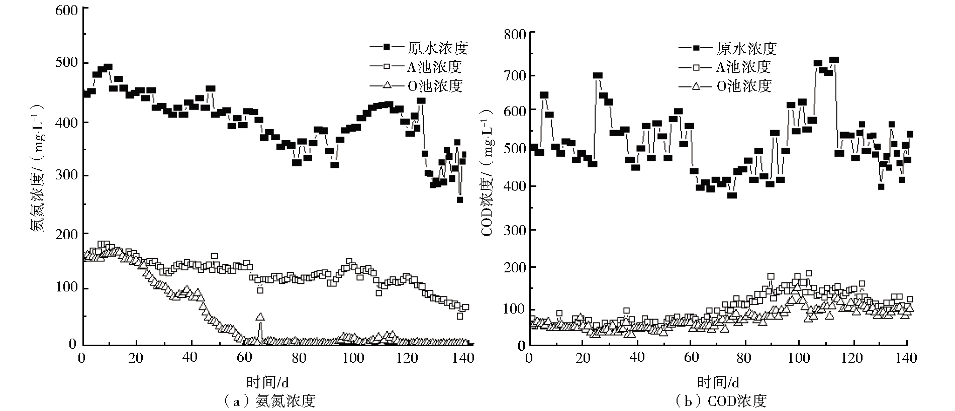廢水中常規(guī)指標(biāo)檢測方法為:COD采用微波消解法;氨氮采用納氏試劑分光光度法(HJ 535-2009);硝態(tài)氮采用麝香草酚分光光度法(GB/T 5750.5-2006);亞硝態(tài)氮利用N-(1-萘基)-乙二胺分光光度法(GB/T 7493-1987);污泥濃度(MLSS)利用恒重法;pH采用PHB-2型pH計;DO采用LDO™ 便攜式溶氧儀。