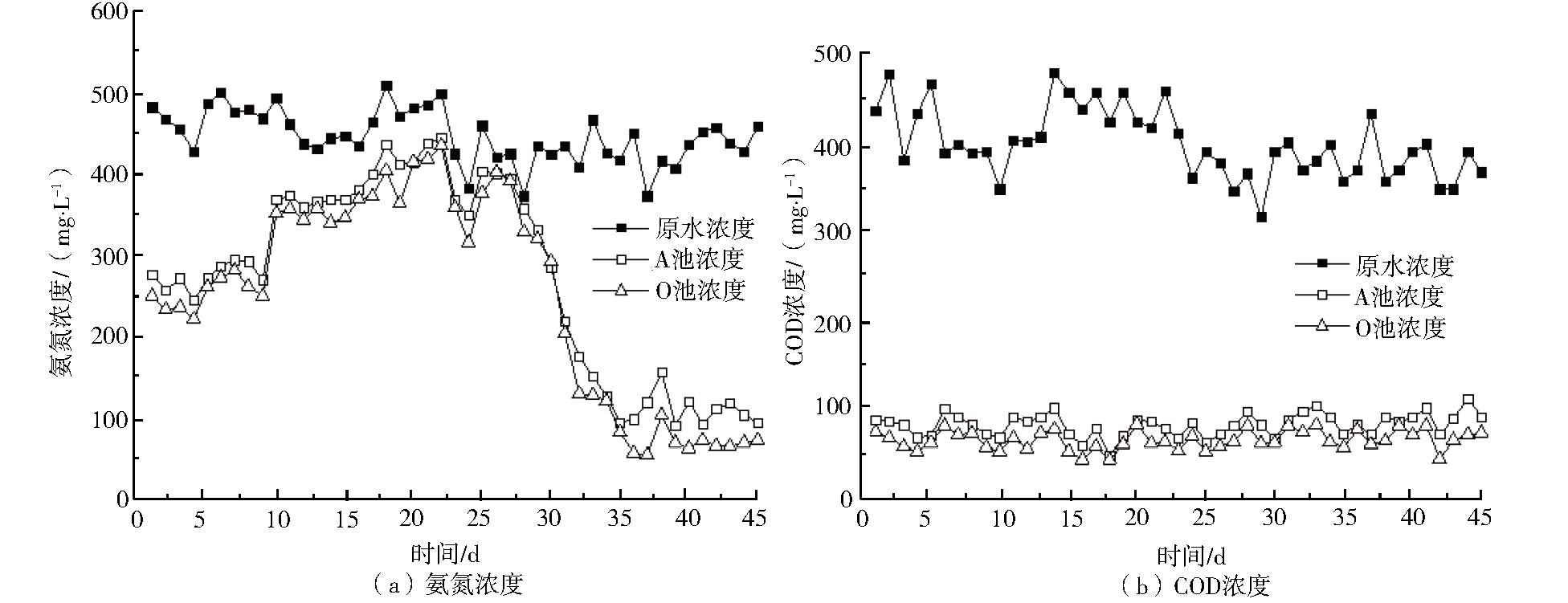 由圖3可知,實驗室AO反應(yīng)器進(jìn)水COD濃度為315~478 mg·L−1,最終出水COD濃度為40~80 mg·L−1,COD去除率為78.57%~90.83%,COD平均去除率為84.22%。進(jìn)水氨氮濃度為364~521 mg·L−1,最終出水氨氮濃度為49.9~434.7 mg·L−1,氨氮去除率為4.21%~88.50%,氨氮平均去除率為39.57%。反應(yīng)器脫氮效率達(dá)到88.50%,認(rèn)為反應(yīng)器啟動成功。COD去除效果變化不明顯,前期污泥馴化階段直到最后,COD去除率均在90%以上,甚至出現(xiàn)0 mg·L−1,證明該實驗反應(yīng)器進(jìn)水可能存在碳源不足的情況,需外加碳源提高脫氮性能。前期(第1~10天)和中期(第11~35天)污泥馴化階段處理效果較差,后期(第36~45天)處理效果逐漸好轉(zhuǎn),結(jié)果表明該淀粉工業(yè)污水處理廠的活性污泥對相同氨氮、COD濃度的淀粉工業(yè)廢水及葡萄糖模擬廢水均能達(dá)到較好的處理效果。鐘振興等通過接種實際污水廠好氧池污泥,以實驗室反應(yīng)器處理模擬廢水時發(fā)現(xiàn),COD和氨氮的去除率分別高達(dá)90.9%和90.4%,并基本保持穩(wěn)定,這與本研究結(jié)果相一致。